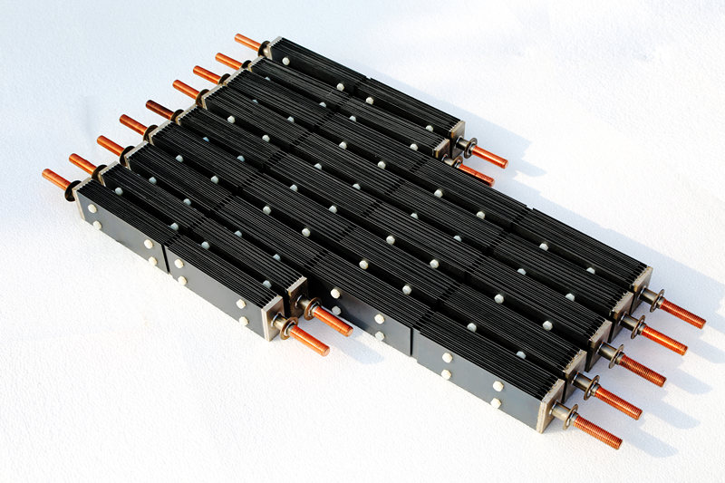 陽極材料可以選用涂層鈦電極。混合氧化物涂層鈦陽極,使用壽命長,此種涂層鈦陽極的過電位也比較低,析氯電流效率高,節(jié)能效果好。